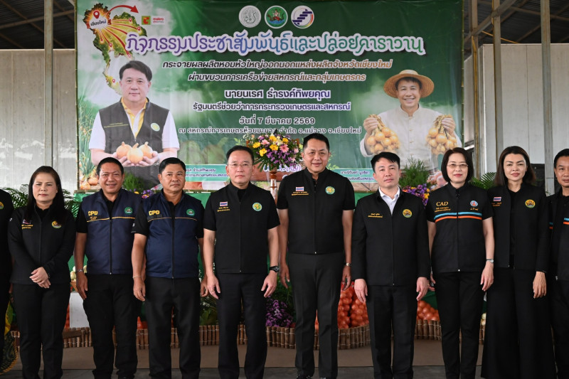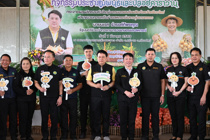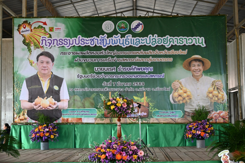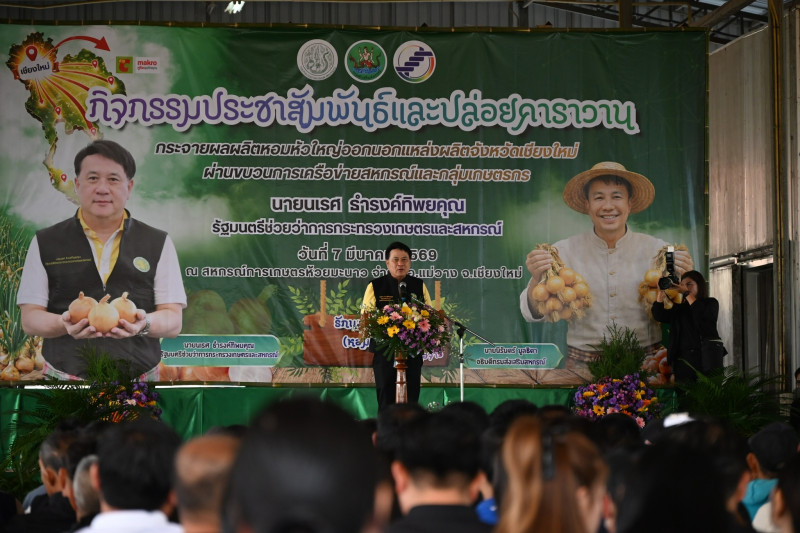 เชียงใหม่, 7 มีนาคม 2569 - นายนเรศ ธำรงค์ทิพยคุณ รัฐมนตรีช่วยว่าการกระทรวงเกษตรและสหกรณ์ เป็นประธานในพิธีปล่อยคาราวานหอมหัวใหญ่ 🧅🚚 กิจกรรมกระจายผลผลิตหอมหัวใหญ่ออกนอกแหล่งผลิต ภายใต้แคมเปญ “รักนะจึงให้หอม (หอมหัวใหญ่) เชียงใหม่เน้อจ้าว” ❤️🧅 จำนวน 12 คัน สู่ตลาดปลายทางทั่วประเทศ 🇹🇭 กระจายผลผลิตหอมหัวใหญ่คุณภาพดีจากแหล่งผลิตสู่ผู้บริโภคอย่างทั่วถึง บรรเทาปัญหาผลผลิตล้นตลาด สร้างรายได้ 💰 และยกระดับคุณภาพชีวิตของสมาชิกสหกรณ์และเกษตรกรผู้ปลูกหอมหัวใหญ่ ณ สหกรณ์การเกษตรห้วยมะนาว จำกัด ตำบลดอนเปา อำเภอแม่วาง จังหวัดเชียงใหม่ 📍 โดยมี นายนิรันดร์ มูลธิดา อธิบดีกรมส่งเสริมสหกรณ์ คณะผู้บริหารกรมส่งเสริมสหกรณ์ หัวหน้าส่วนราชการ ขบวนการสหกรณ์ และเกษตรกรในพื้นที่อำเภอแม่วางและสันป่าตองเข้าร่วม 👥